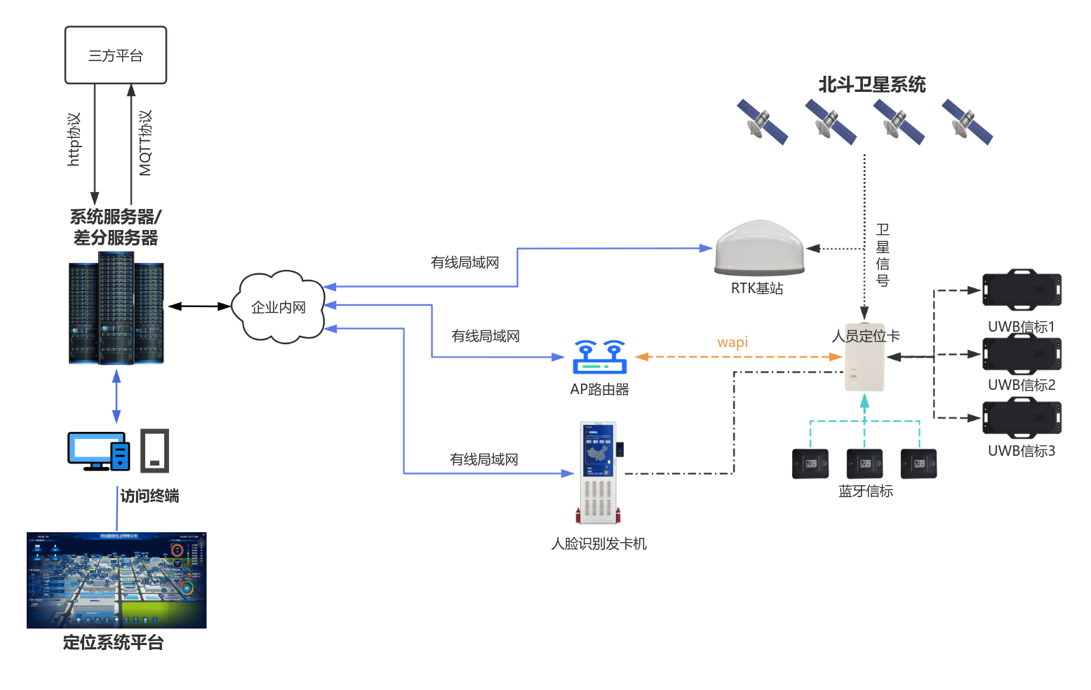 該系統(tǒng)的核心競(jìng)爭(zhēng)力在于突破性的多技術(shù)融合架構(gòu),針對(duì)化肥廠室內(nèi)外差異化環(huán)境、不同風(fēng)險(xiǎn)區(qū)域的定位需求,實(shí)現(xiàn)了全場(chǎng)景無(wú)縫覆蓋與精度動(dòng)態(tài)適配。在廠區(qū)開闊區(qū)域,如原料堆場(chǎng)、運(yùn)輸主干道、罐區(qū)外圍等,系統(tǒng)采用北斗RTK技術(shù)構(gòu)建基礎(chǔ)定位網(wǎng)絡(luò)。北斗系統(tǒng)作為我國(guó)自主可控的衛(wèi)星導(dǎo)航技術(shù),具備全天候、抗干擾的穩(wěn)定服務(wù)能力,結(jié)合RTK實(shí)時(shí)動(dòng)態(tài)差分技術(shù),可通過(guò)基準(zhǔn)站與移動(dòng)終端的實(shí)時(shí)數(shù)據(jù)交互,消除干擾因素,確保室外人車定位的高精度輸出,為車輛調(diào)度、室外巡檢路線監(jiān)控提供可靠數(shù)據(jù)支撐。